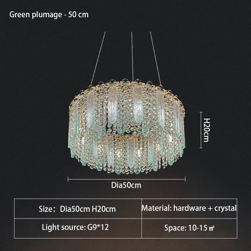 1. Élégance en cristal et plumes : Orné d'éléments en cristal et de délicates plumes, ce lustre respire l'opulence et capture l'essence même du design luxueux et lumineux.
