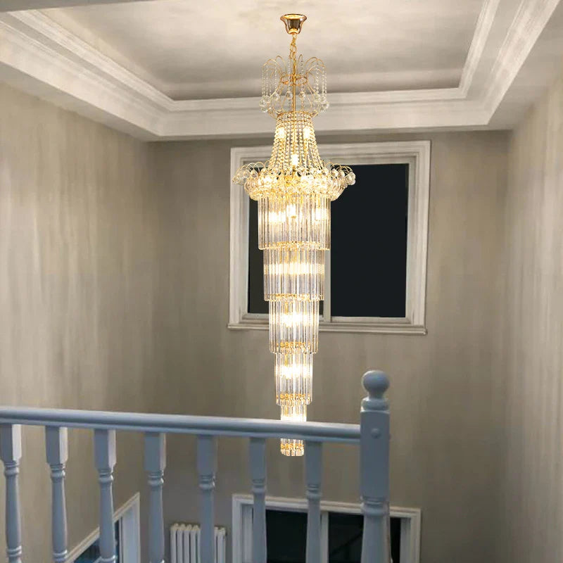 Améliorez votre décoration intérieure, vos grands halls, vos espaces à haut plafond, vos cages d'escalier et vos hôtels de luxe avec le lustre à haut plafond en duplex de style européen. Il s'agit d'une pièce de déclaration élégante qui ajoute une opulence européenne, un corps doré et des éléments en cristal épurés à votre espace. Illuminez votre espace avec ce lustre élégant et fonctionnel, doté de détails exquis qui améliorent l'esthétique générale et créent un sentiment de grandeur et de luxe dans votre maison ou votre environnement commercial.