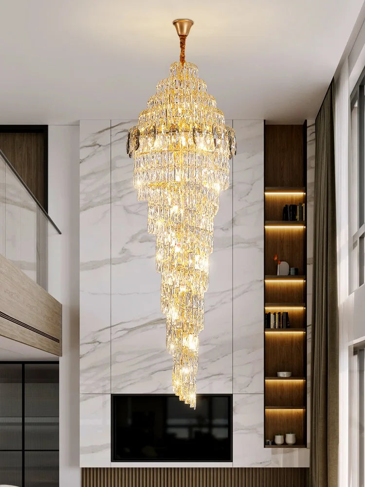 Lustre d'escalier de luxe moderne - Élégance dorée avec accents de cristal pour immeubles en duplex, hauts plafonds et éclairage décoratif