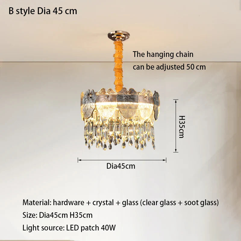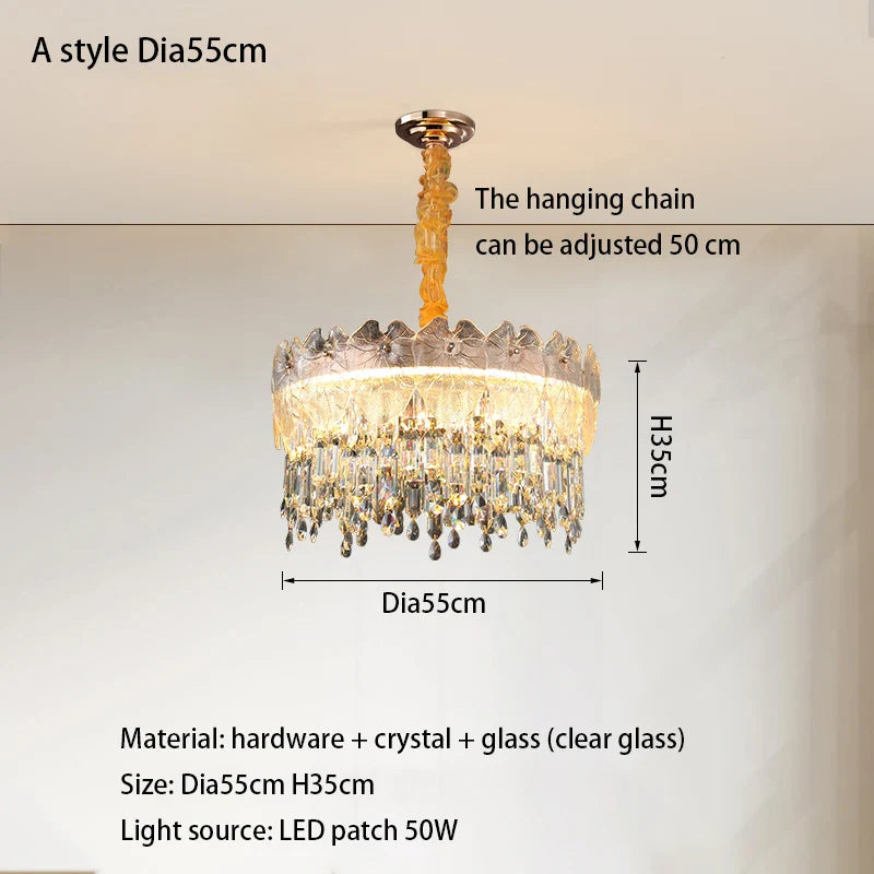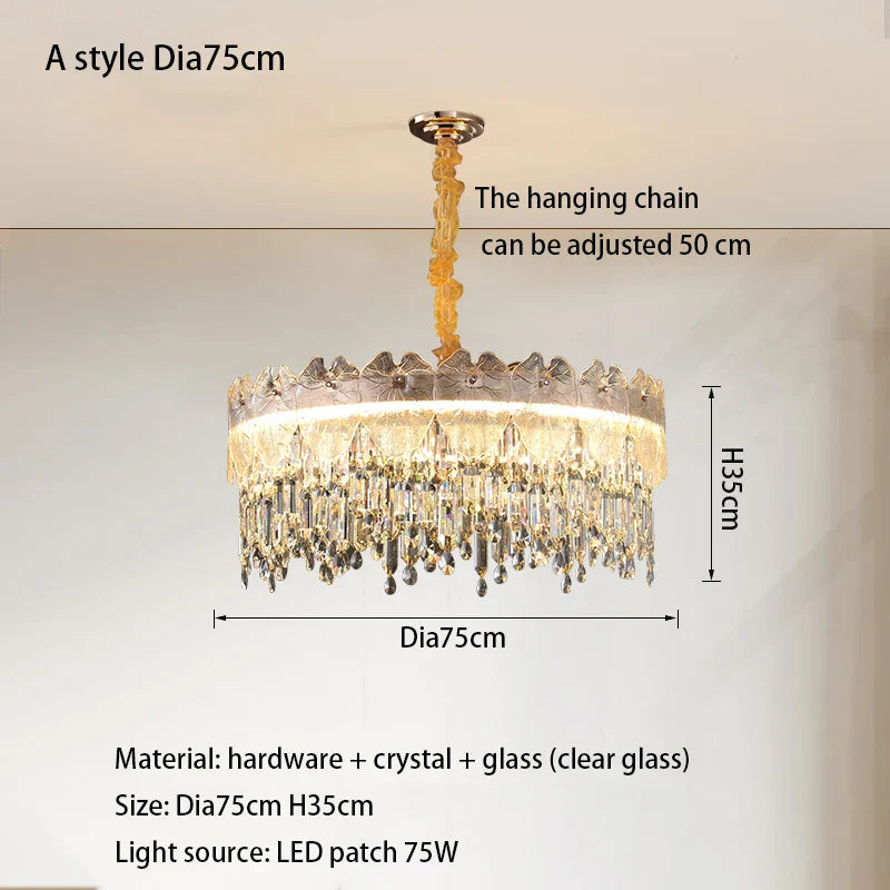 Élégance dorée et cristal : Orné d'éléments dorés et cristallins, ce luminaire crée un jeu de lumière éblouissant, ajoutant une touche de luxe et améliorant l'ambiance générale de la pièce.