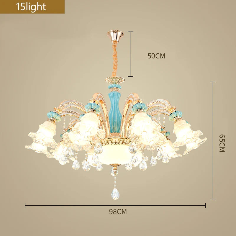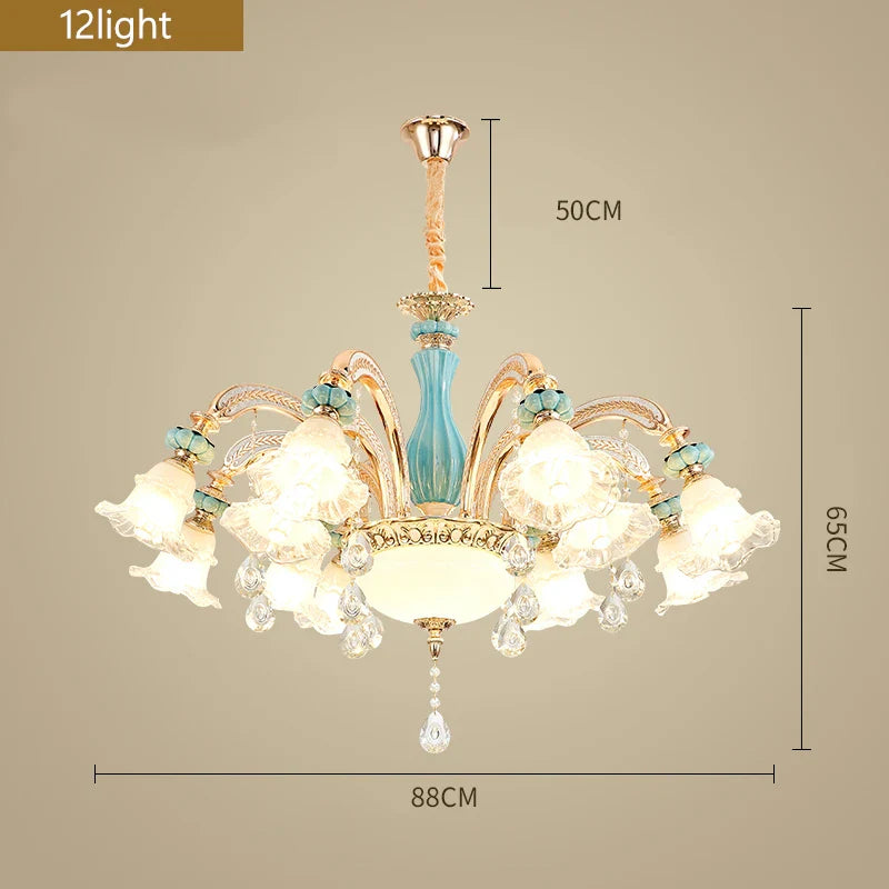 1. Élégance cristalline : Orné d'éléments en cristal, ce lustre respire l'opulence et capture la beauté intemporelle du design européen.