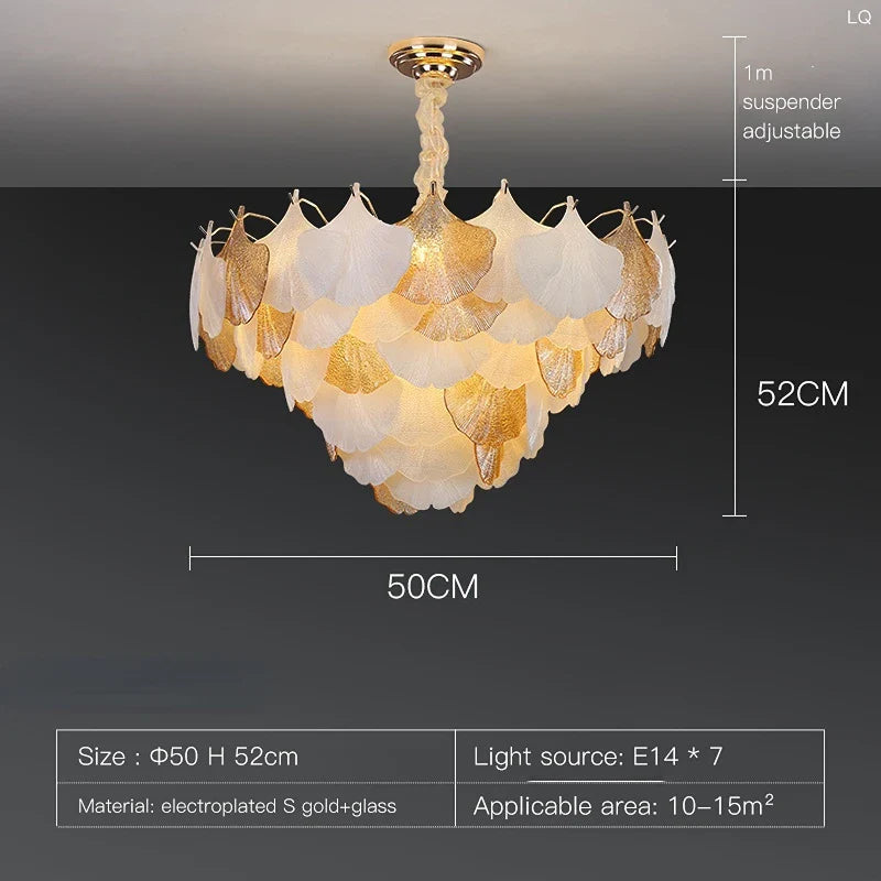 Description du produit : Sublimez l’ambiance de votre salon, salle à manger ou chambre avec notre lustre moderne à LED en forme de feuilles de ginkgo. Ce luminaire d’exception allie design contemporain et charme intemporel du décor en verre lustré français. Fabriqué avec précision à partir d’acier inoxydable et de verre de haute qualité, il incarne le luxe.