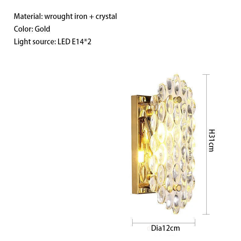 Découvrez l'applique murale Lyric Nordic Postmodern Minimalist Crystal Villa : une superbe incarnation du design contemporain et d'une personnalité artistique affirmée, qui sublimera l'ambiance de votre chambre, salon, couloir ou tout autre espace intérieur. Cette applique unique se distingue par son corps doré et sa structure en fer finement travaillée, ornée de délicats détails en cristal. D'un diamètre de 12 cm et d'une hauteur de 31 cm, elle offre un éclairage polyvalent grâce à son ampoule LED E14 incluse, dont la couleur peut être modifiée selon vos envies.