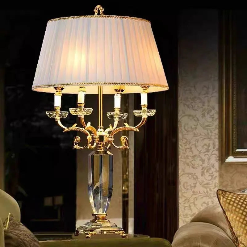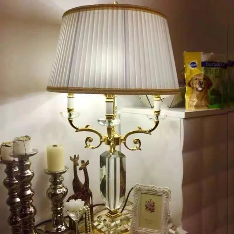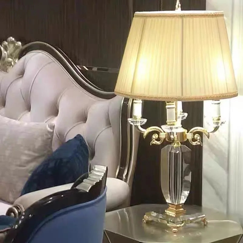 Lampe de table européenne moderne en cristal doré avec abat-jour en tissu pour chambre à coucher