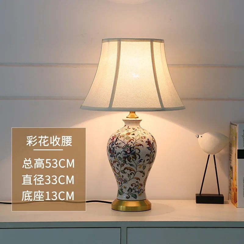 Lampadaire rétro en céramique peinte avec LED et abat-jour en tissu plissé